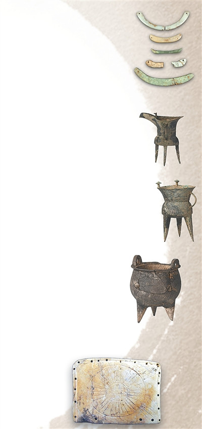 图片从上至下离别为河南南阳黄山名胜出土的玉璜,山西西吴壁名胜墓葬出土的铜、陶礼器,安徽凌家滩名胜出土的玉版。良友图片