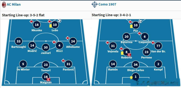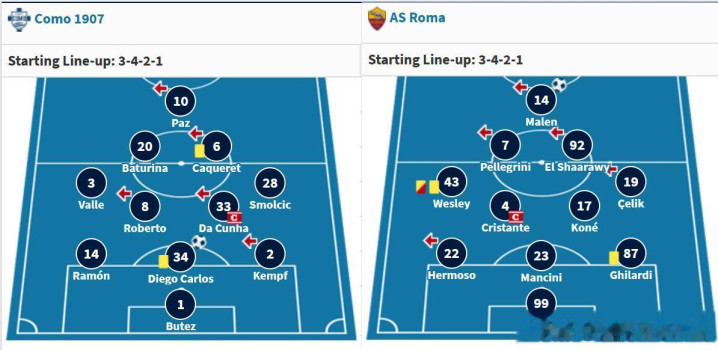 本赛季,科莫仅在两场比赛里,以三后卫体系首发,折柳是联赛第24轮客场对阵AC米兰(最终1-1打平),以及联赛第29轮对阵罗马(2-1取胜)。更具体的说,这两战,科莫都莫得让队内的9号位中锋(杜维卡斯或莫拉塔)首发,都是派上所谓的“无锋阵”,以保证更强的中场放胆力、活力和逼抢才调。