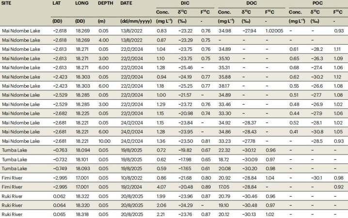 在这项酌量中,酌量东说念主员通过对湖水中融解的二氧化碳进行同位素分析,终局让东说念主未必:马伊恩东贝湖的融解无机碳(DIC,dissolved inorganic carbon)平均发射性碳年齿为 2,170 年,图姆巴湖的数值则高达 3,515 年。