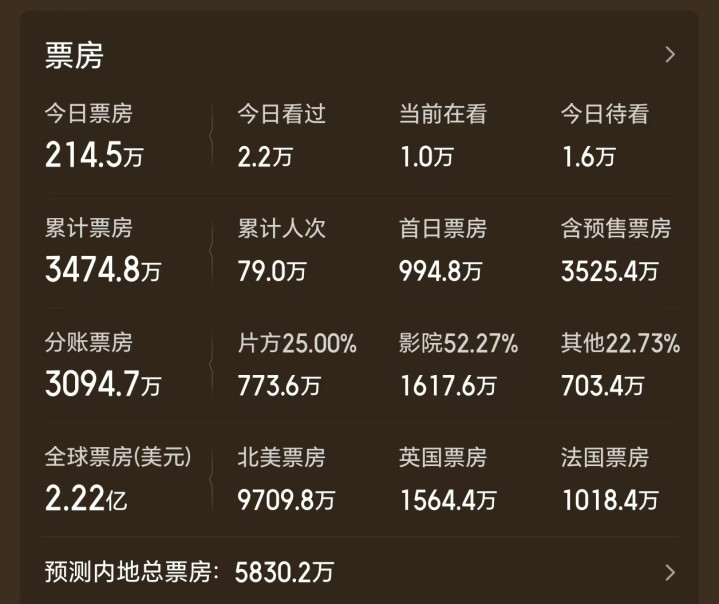 至于后者,当今的总票房不到14.5亿东说念主民币,在国内仅次于《飞奔东说念主生3》,暂居第二名。该片单日票房降至20万东说念主民币以内,瞻望最终票房也不会逾越14.5亿东说念主民币。