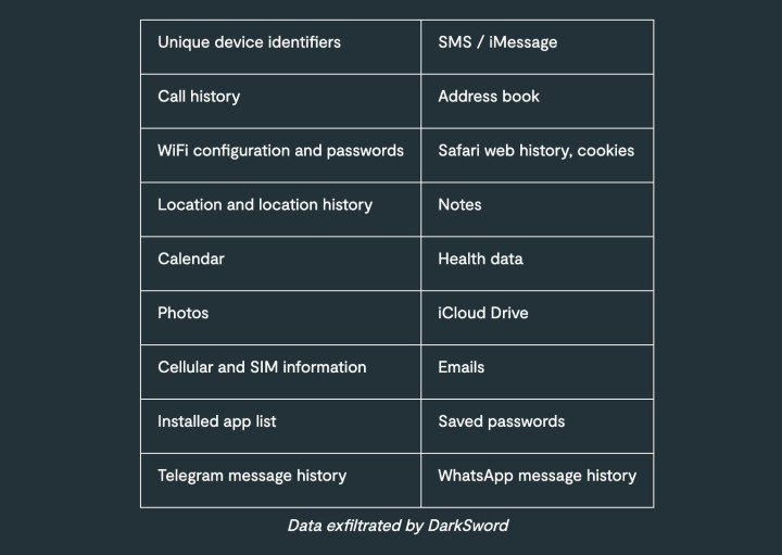 DarkSword_窃取的信息,来自 Lookout 分析推崇