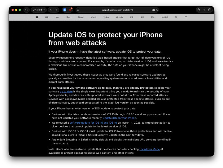 昨日咱们报说念了 iOS 18 部分版块存在严重安全破绽,可能导致 iPhone 在看望坏心网页时被挫折。而就在归并天,苹果官网有益上线了一份新文档,督促用户尽快升级系统,侧面评释关系破绽的影响界限还是特地广,以至可能已被大限制期骗。