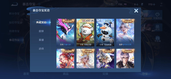 那么暴击夺宝有什么公正呢:谜底是如若只差小数就集皆统共荣耀典藏皮肤和小兵皮肤,那么领受暴击夺宝能省不少钱。