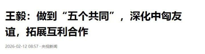 央视新闻:2026-02-12:王毅:作念到“五个共同”,真切中匈友谊,拓展互利协作