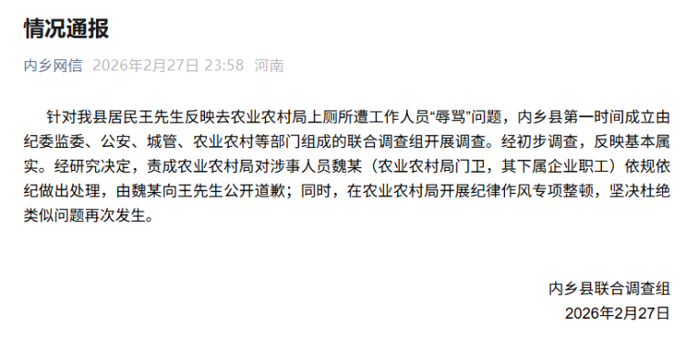 尊龙国际 河南内乡县一住户在农业农村局上茅厕遭使命主说念主员“瑕瑜”,官方通报