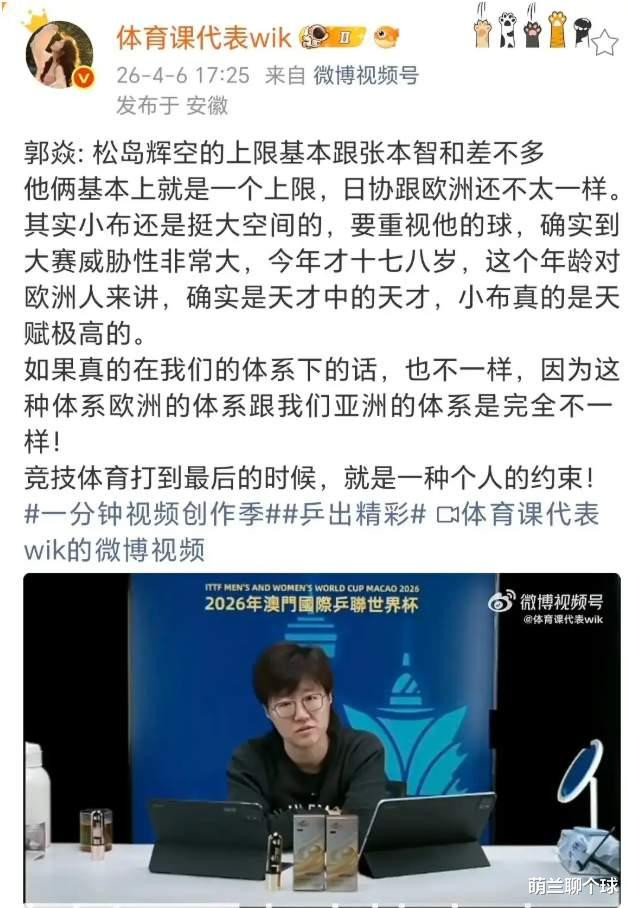 北京时辰4月7日音问,CBA的喧嚣尚未散尽,乒乓球赛场的风暴已悄然升级。澳门天下杯决赛,18岁的日本新星松岛辉空以3比2逼平王楚钦,丢掉冠军后拒绝与王楚钦执手,单局狂轰11比0击溃瑞典名将莫雷高德,连斩张禹珍、林昀儒,一战封神。外界惊呼:“国乒头号强敌来了!”但国乒名宿郭焱的一句“松岛上限与张本智和相配”,片刻拨开迷雾。