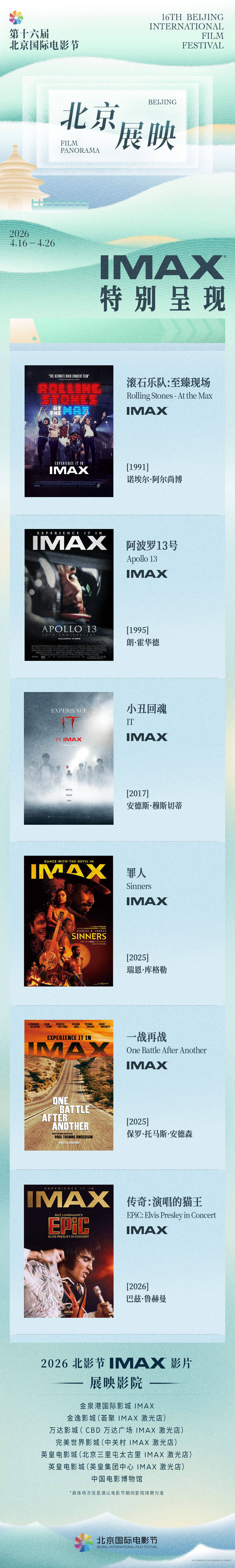 第十六届北京海外电影节展映将于2026年4月16日至26日举行,IMAX展映片单本日厚爱揭晓,《滚石乐队:至臻现场》《阿波罗13号》《怯夫回魂》《罪东谈主》《一战再战》《听说:演唱的猫王》六部横跨剧情、音乐、纪实等多元类型的重磅之作,将借助IMAX的超大银幕与千里浸式音效,为影迷送上一场视听与心灵的双重盛宴。当听说音乐现场在IMAX无垠声场中重现,当广袤天外与惊悚小镇在大银幕之上铺展,电影与不雅众之间的范围将被透澈松懈,每一帧光影齐将垂手而得。