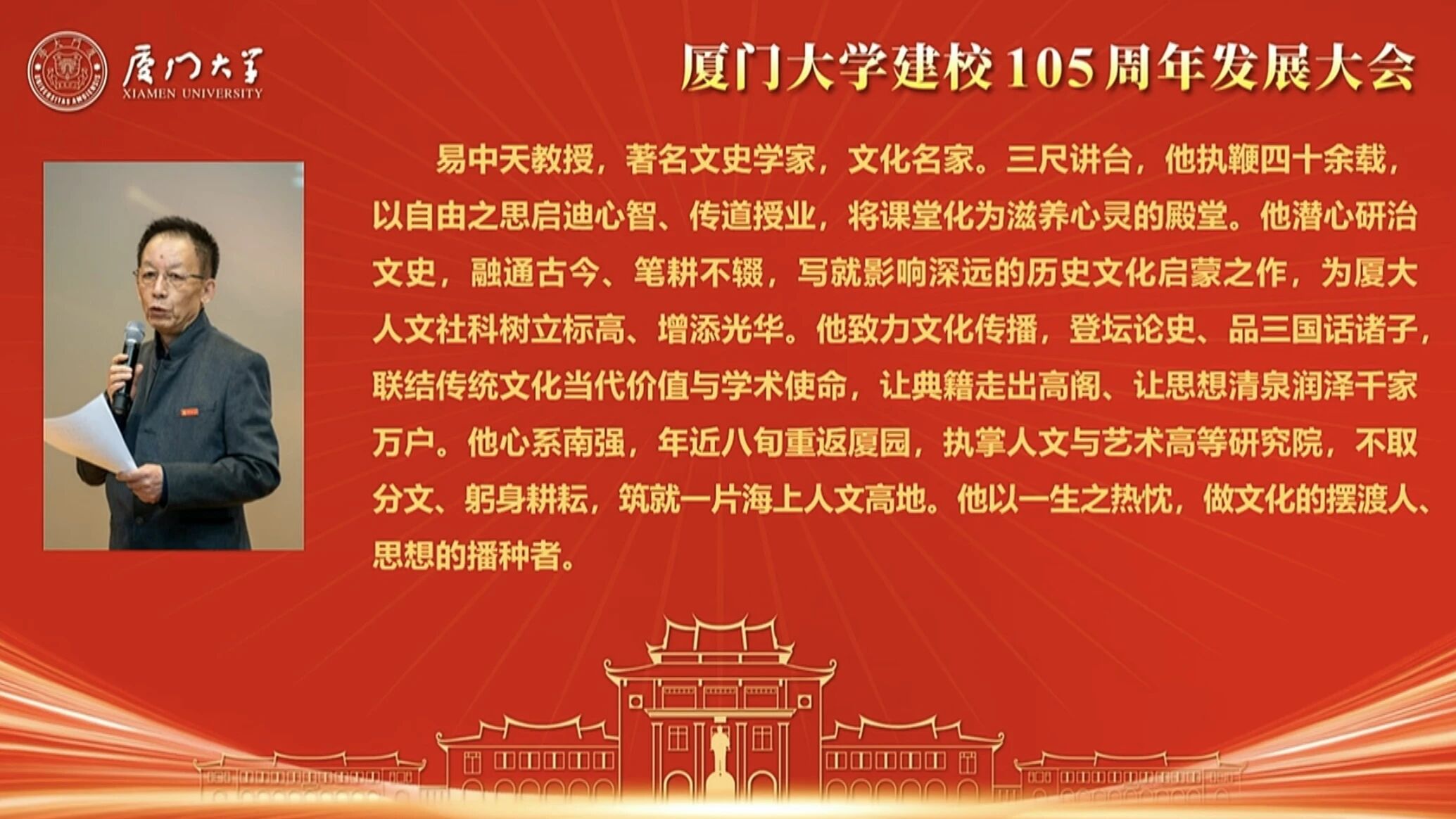 4月6日,厦门大学建校105周年发展大会上,知名学者、文假名东说念主易中天被授予“南强卓越孝敬奖”。
