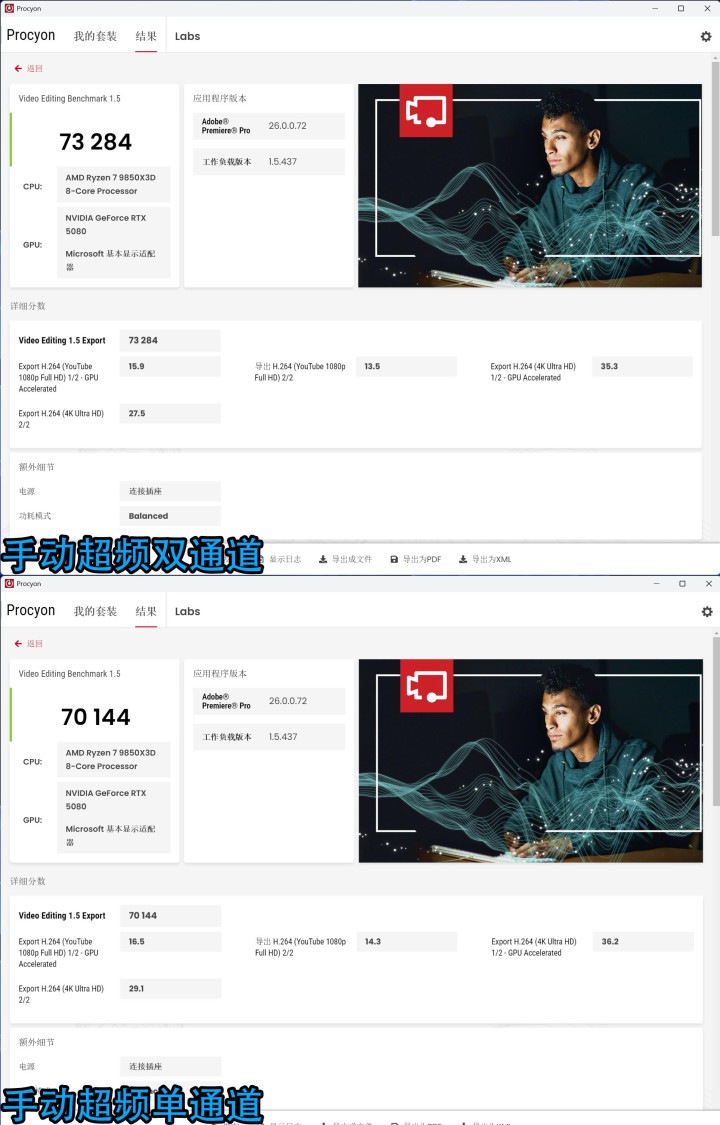 ↑女武神二代DDR5 8000C34,Procyon Video Editing Benchmark 1.5 手动超频双通谈分数为73284,单通谈为70144