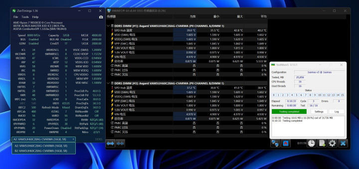 领先成功沟通一下女武神二代DDR5 6000C28手动超频后劲,一番折腾之后,最终能达到DDR5 8000C34-47-47-58,副时序和第三时序均可优化到位,VDD和VDDQ电压均设定1.6V。在格外散热电扇扶植下,可烤机通过TestMem5 V3@1usmus配三轮,两根内存最高温度折柳为37℃和39℃,确乎是海力士A-Die颗粒的常见发达。