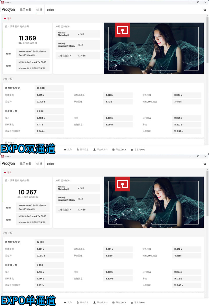 ↑女武神二代DDR5 6000C28,Procyon相片剪辑基准EXPO双通谈分数为11369,单通谈为10267