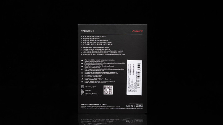 包装后头标注了女武神二代相干卖点,比如系列纯粹外不雅、高导热硅脂垫&2mm散热片、可孤立限度Amicc灯珠、主板灯光体系撑抓等,下方还有多国言语简要清楚和官方媒体号标注。