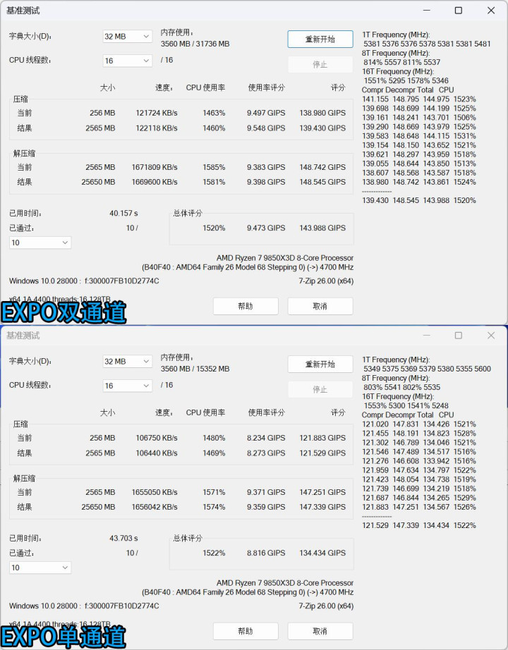 ↑女武神二代DDR5 6000C28,7-Zip EXPO双通谈VS单通谈