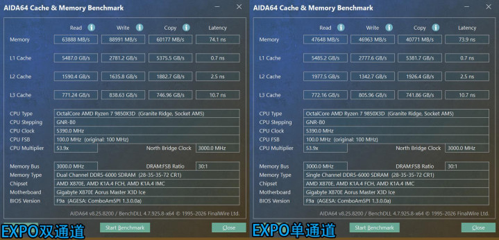 ↑女武神二代DDR5 6000C28,AIDA64 EXPO双通谈VS单通谈
