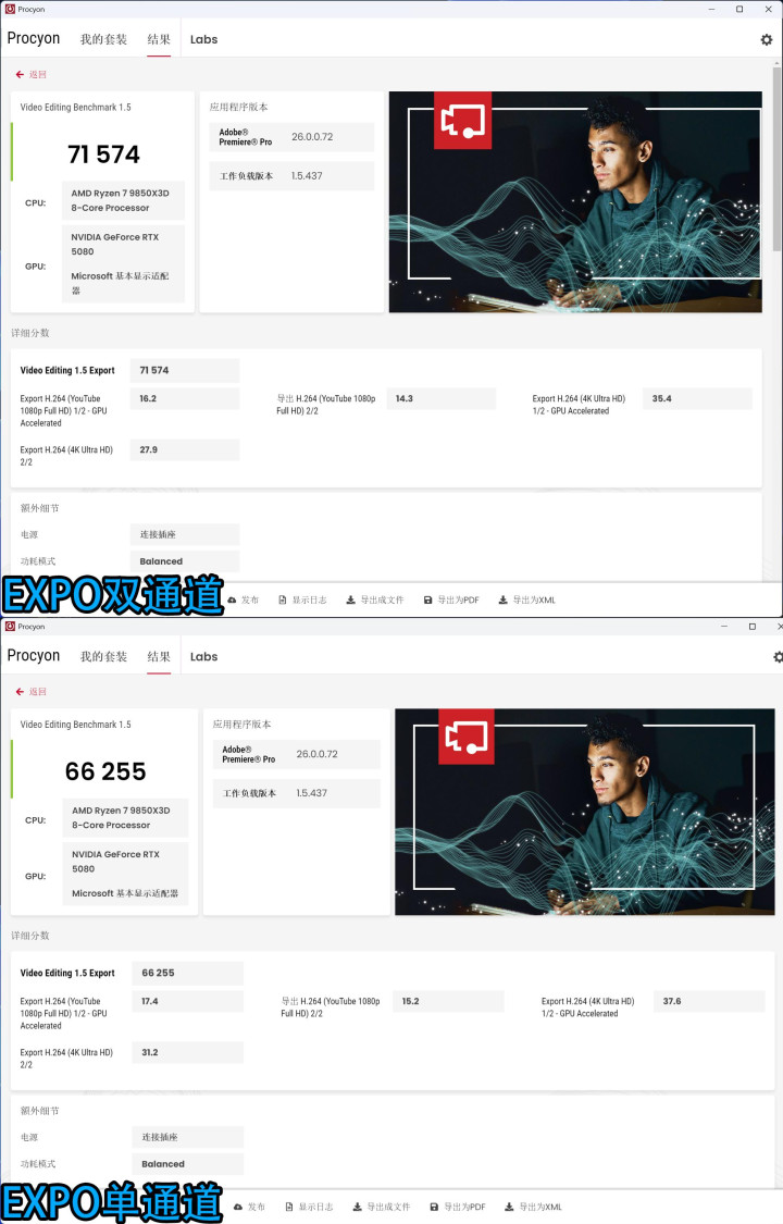 ↑女武神二代DDR5 6000C28,Procyon Video Editing Benchmark 1.5 EXPO双通谈分数为71574,单通谈为66255