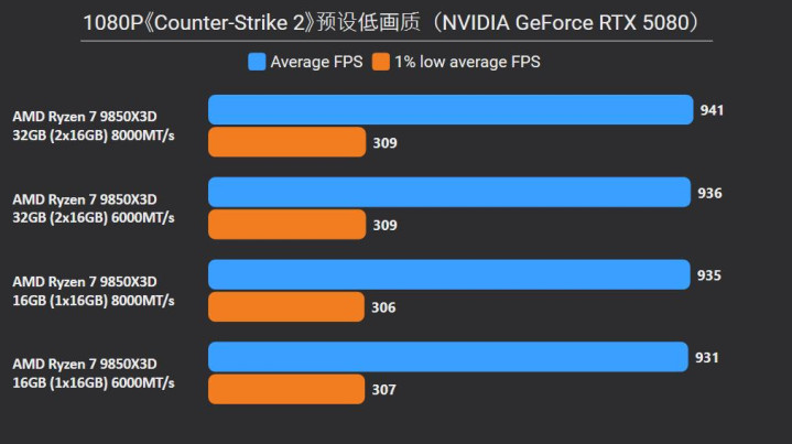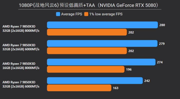 这里多提一嘴,《骑马与砍杀2》也领有大战场,然而它的侧重心在于单核性能决定帧数上限,大缓存来兜底,确保1% LOW帧弥散高,是以关于9850X3D超内存粗拙只可提高1% LOW帧。