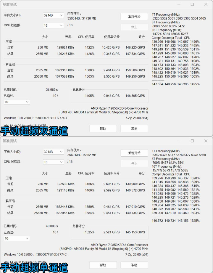↑女武神二代DDR5 8000C34,7-Zip 手动超频双通谈VS单通谈