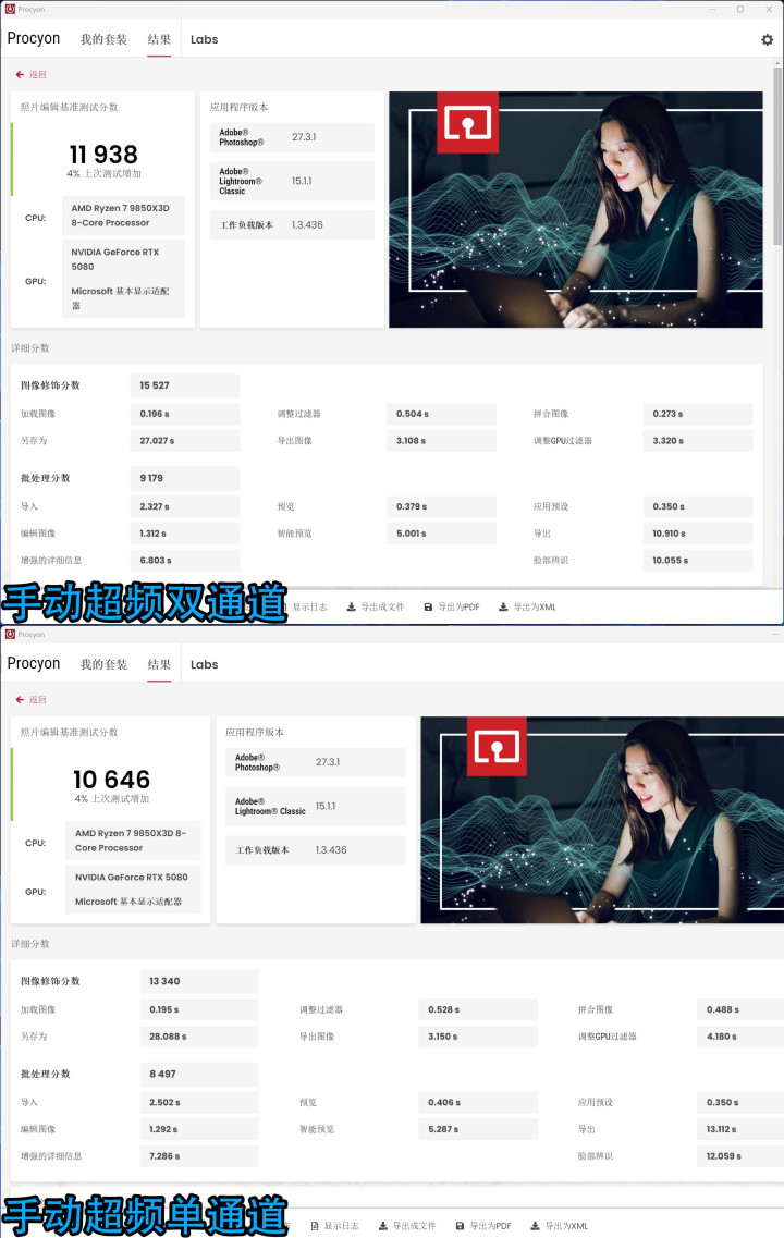 ↑女武神二代DDR5 8000C34,Procyon相片剪辑基准手动超频双通谈分数为11938,单通谈为10646