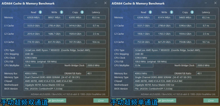 ↑女武神二代DDR5 8000C34,AIDA64 手动超频双通谈VS单通谈