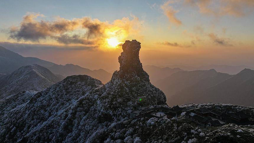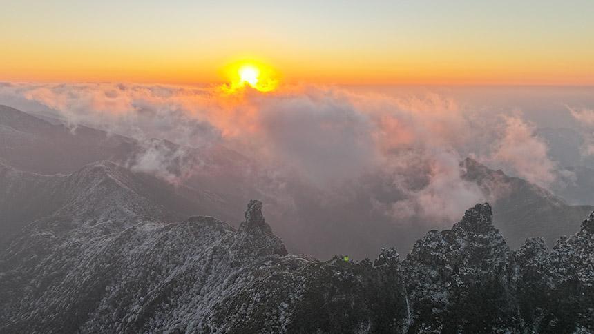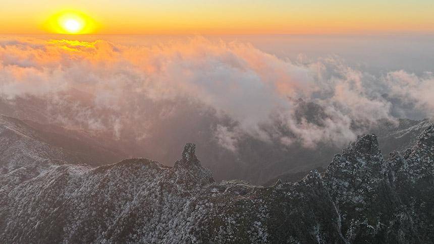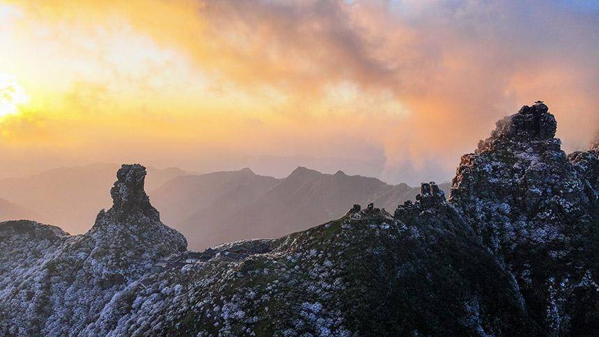 天下当然遗产地梵净山景区现雪淞沐霞奇不雅。