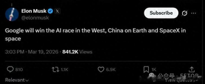 翻译过来便是:西方 AI 看谷歌,地球 AI 看中国,天外 AI 看 SpaceX。